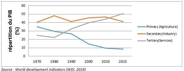 Ainsi, en 2019 la Chine a déposé 58990 demandes internationales de brevets, dépassant ainsi pour la première fois les Etats-Unis (57840).  Plus de 197 entreprises de plateformes numériques valant chacune plus d’un milliard de dollars ont été recensés sur le territoire chinois en 2020. La valeur ajoutée e l’industrie manufacturière de haute technologie de la Chine a augmenté de 23,5%. La production de véhicules à énergies nouvelles, de robots industriels, et des circuits intégrés a augmenté respectivement de 205%, 69,8% et 48,1% entre 2018 et 2019. Ce bon technologique a permis à la Chine de concrétiser sa transformation structurelle, avec une migration significative de la production de richesse dans le temps, du secteur primaire vers le secteur tertiaire à haute intensité technologique tel que représenté dans le graphique ci-dessous.