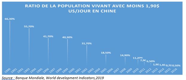 Cette priorisation des stratégies de développement local a eu pour conséquence d’accroître le niveau de vie de la population rurale et plus globalement, de pratiquement éradiquer la pauvreté extrême en Chine. Ainsi, entre 1990 et 2015, la proportion des personnes vivant avec moins de 1,90 dollars US jour est passé en Chine de plus de 66% à moins d’1%, tel que le montre le graphique ci-dessous.