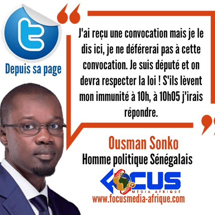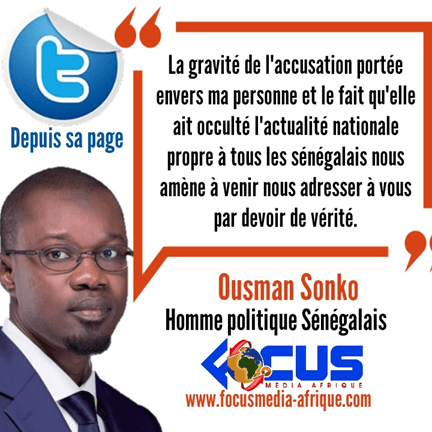 Ousmane Sonko est toujours à son domicile où des éléments des forces de l’ordre quadrillent le quartier. Pour le moment, l’homme politique n’a pas encore porté plainte contre sa plaignante, selon son avocat, Me Bamba Cissé. Depuis son domicile Ousmane Sonko s’explique par le biais des tweets sur son compte :