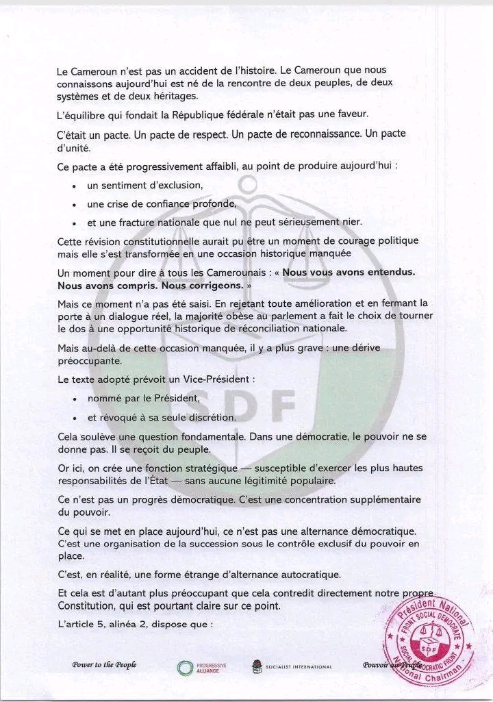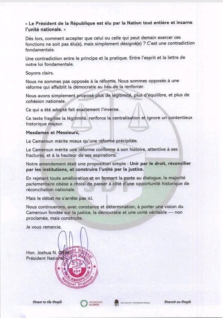 Pour le SDF, cette réforme fragilise la légitimité démocratique et renforce la centralisation du pouvoir. “Le Cameroun mérite mieux qu’une réforme précipitée”, conclut Osih, promettant de poursuivre le combat pour une unité nationale fondée sur la justice et la démocratie.