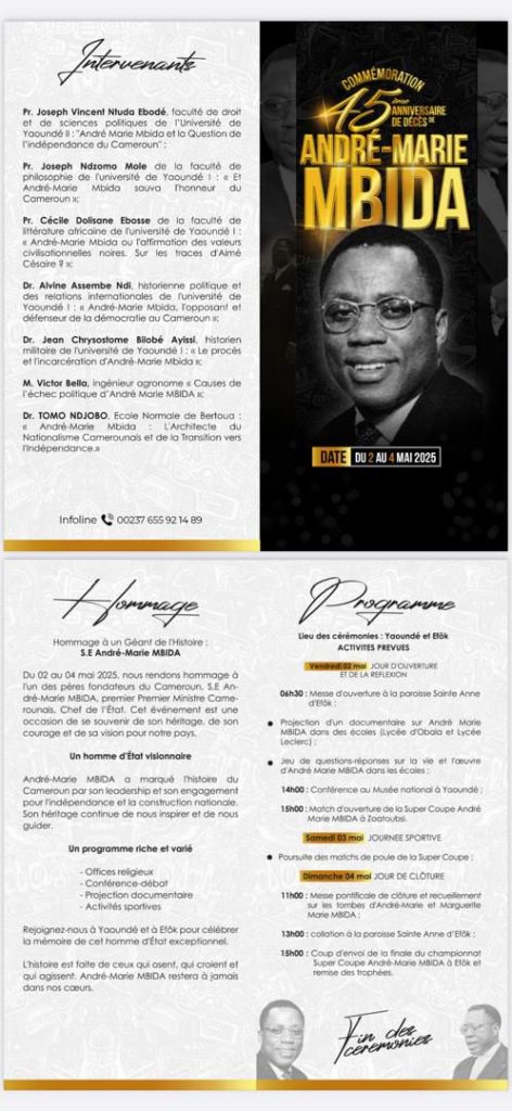 C’est davantage pour briser le silence que la famille nucléaire du tout premier Chef d’État et de gouvernement du Cameroun, avec le soutien du Cabinet civil de la Présidence de la République du Cameroun, a décidé d’organiser cette commémoration des 45 ans d’anniversaire de décès d’André Marie MBIDA. Des têtes couronnées de la vie publique camerounaise sont attendues lors de ces deux jours d’hommage.