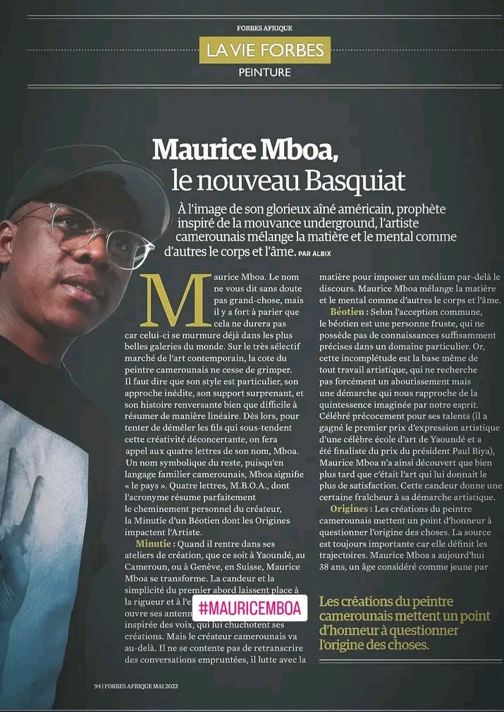 Dans les milieux des arts plastiques internationaux, le nom de Maurice Mboa revient avec insistance parmi les artistes contemporains africains les plus imaginatifs. Ses toiles et autres créations, souvent réalisées à partir de gravures sur toile, sont exposées en Suisse où il est établi depuis 2016, mais également dans toute l’Europe (France, Allemagne, Israël, Angleterre), au Moyen-Orient et aux États-Unis.Dix ans après son départ du Cameroun, le plasticien a acquis une solide expérience et semble avoir atteint aujourd’hui sa vitesse de croisière. Le jeune peintre des années 2000, exposant à Africea et dans les antennes de l’Institut français du Cameroun, a pris du galon.En 2022, en raison de son travail artistique centré sur l’origine des choses, le magazine Forbes Afrique le présentait comme le « nouveau Basquiat », en référence au peintre afro-américain Jean-Michel Basquiat.De passage au Cameroun, Maurice Mboa a révélé les principaux piliers de son art.