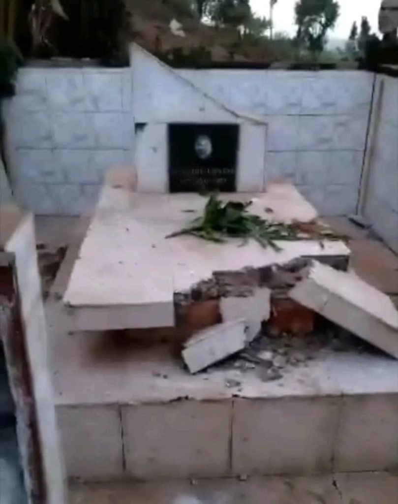 L’acte a laissé derrière lui un spectacle de désolation. Des carreaux de la tombe brisés, et une partie de la dalle recouvrant la sculpture endommagée. Des blocs de parpaings retrouvés sur place, portent , silencieusement les marques d’un mépris caractérisé aux valeurs, d’un manquement au devoir de mémoire.