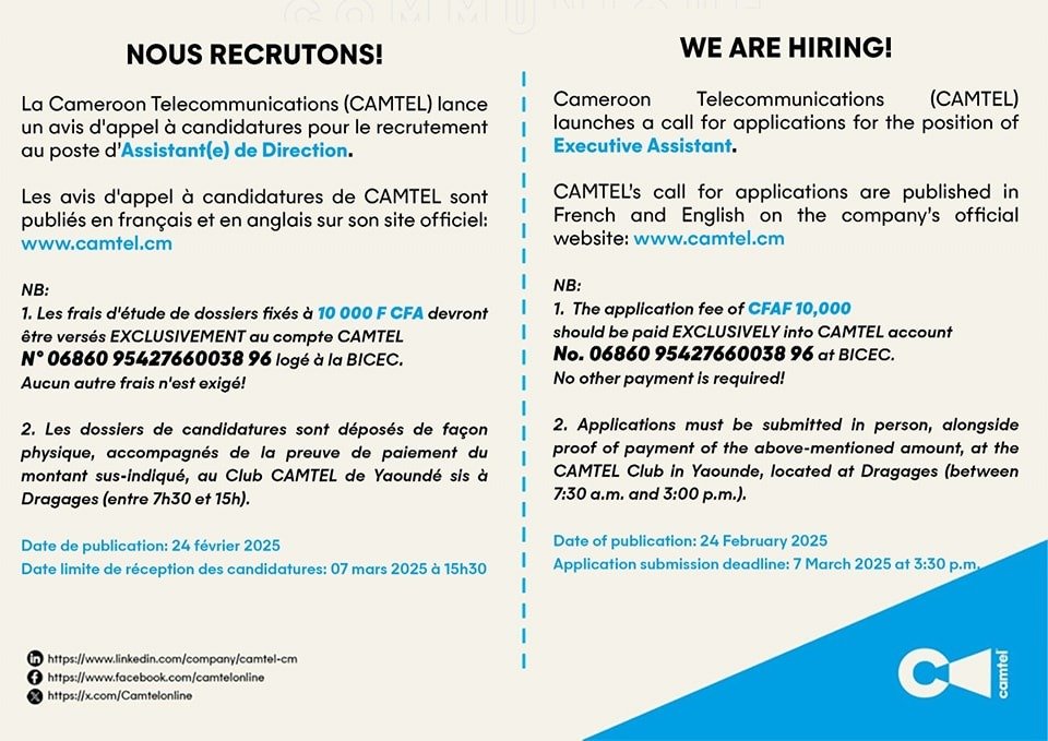 L’annonce récente de Camtel, l’opérateur public de télécommunications camerounais, concernant le recrutement d’une assistante de direction a provoqué une vague d’indignation sur les réseaux sociaux et au sein de l’opinion publique. En cause : l’exigence de 10.000 FCFA de frais de dossier pour chaque candidature, une décision perçue comme inappropriée et même scandaleuse par de nombreux Camerounais.