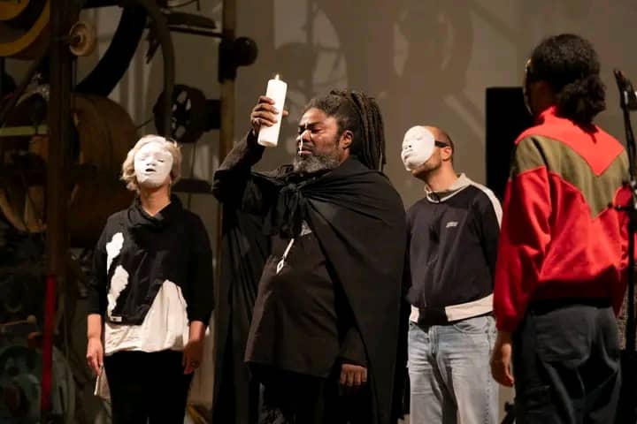 Au cœur de la performance, neuf masques rituels. Le dixième, volé, doit être retrouvé par le Ngue’Nguang, maître spirituel. Le passeur de lumière traverse alors plusieurs rites — Bisim, Tso, Esié — symboles de purification, de guérison et de réconciliation. Moment fort : Etongo fait fondre une bougie blanche sur son front, la cire brûlante coulant sur son visage. « Le front représente la tête du Totem. La cire est un symbole de renaissance. L’Afrique doit cesser de pleurer sur son passé pour composer avec le présent », explique-t-il.