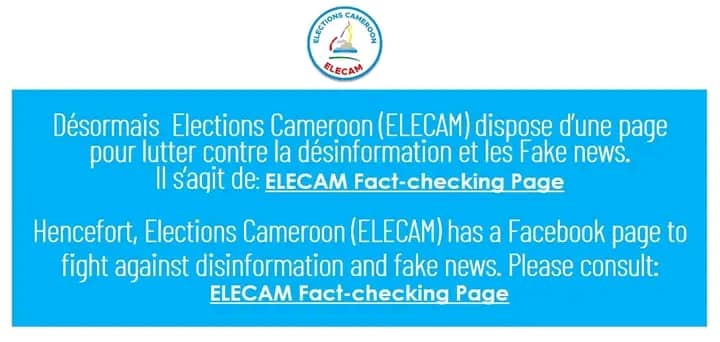 Créée le 20 février 2025 par l’organe chargé de l’organisation des élections au Cameroun (Elecam), la page Facebook ELECAM Fact-Checking page est dédiée au combat des fake nesws en période électorale.