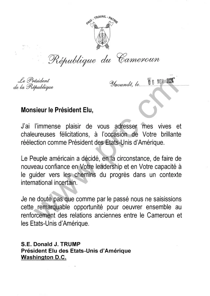 Pour Paul Biya dont cette élection du 47eme président des États-Unis coïncide avec la célébration des 42 ans de son accession à la magistrature suprême au Cameroun, le peuple américain a décidé, en la circonstance, de faire de nouveau confiance au candidat républicain, grâce à son « leadership et sa capacité de le guider vers le chemin du progrès dans un contexte international incertain »