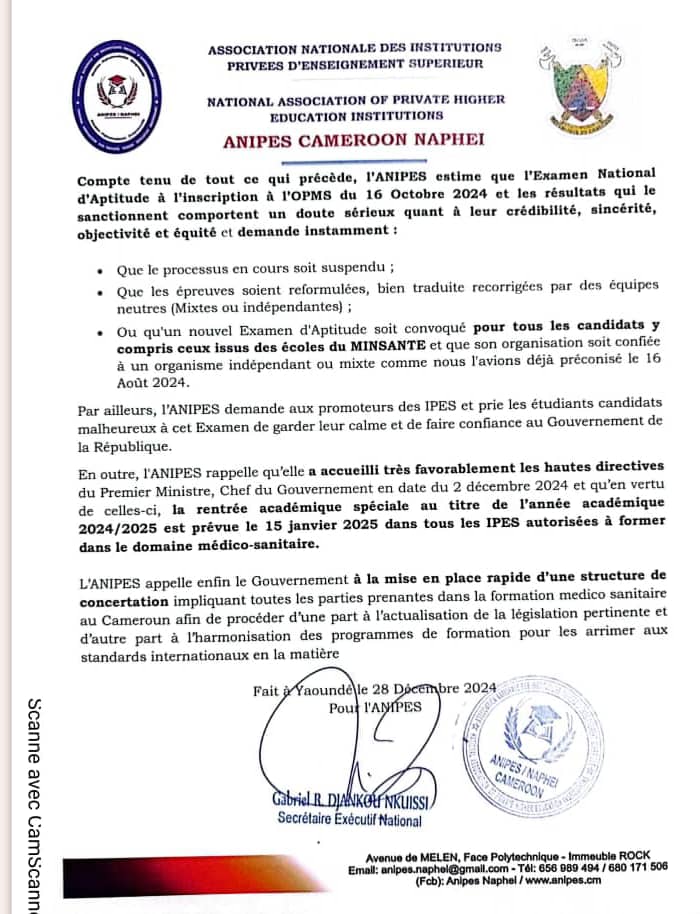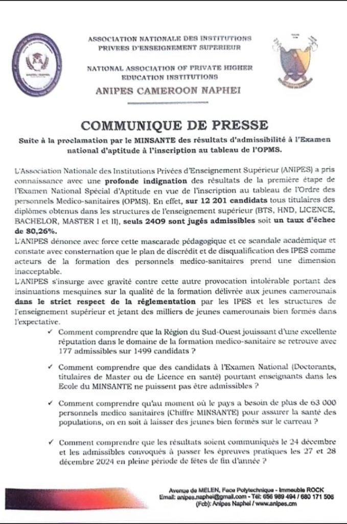 Depuis 2021, les produits issus des IPES qui étaient automatiquement inscrits au tableau de l’ordre ne le sont plus. La qualité de leur formation semblait être mise en cause. Pour y remédier la réunion de concertation tenue le 16 août 2024 entre les ministres de l’Enseignement supérieur et de la Santé publique, il a été décidé que les détenteurs de diplômes de formations courtes, tels que le BTS, le HND et le DSEP, devront désormais passer un examen national d’aptitude à la profession médico-sanitaire pour intégrer l’Ordre des professionnels médico-sanitaires (Opms). Les résultats dudit examen rendu public le 24 Décembre 2024 divisent les deux parties. Pour l’Association nationale des instituts privés d’enseignement supérieur (Anipes) « « Une honte nationale, une vraie mascarade pédagogique, un scandale académique » Dixit Gabriel Raoul DJANKOU NKUISSI, secrétaire exécutif de l’Association nationale des instituts privés d’enseignement supérieur (Anipes)