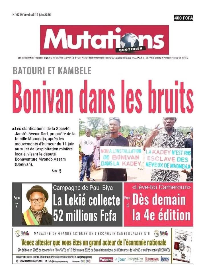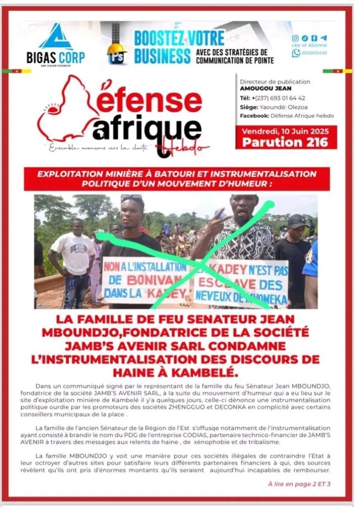 10- Comme l’a rappelé l’un des responsables de la famille MBOUNDJO, propriétaire de JAMB’S AVENIR SARL, on a fait croire aux jeunes qui sont allés brandir quelques revendications pourtant légitimes que leurs terres et sous sol étaient en voie d’être bradées par un ressortissant du sud et neveu du chef de l’Etat. Les marionnettistes de ce mouvement n’ont pas voulu leur dire que la société en question appartient à un fils de la localité et que celui dont on a voulu sacrifier, n’est que partenaire technico-financier de cette société. Aussi, ils ont éviter de préciser que celui dont on a dessiné le nom sur les pancartes est le premier camerounais qui vient d’implanter la première industrie d’exploitation minière de KOLOMINE.