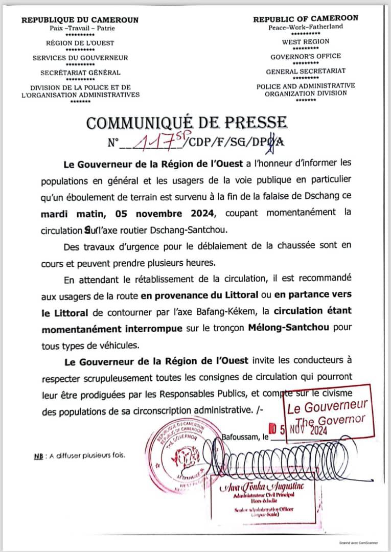 Dans un communiqué signé le 05 Novembre 2024, le gouverneur de la région de l’Ouest informe l’opinion que la circulation est momentanément interrompue sur l’axe Melong-Sanchou pour tout type de véhicule. La raison est l’éboulement de terrain survenu sur la falaise ce matin. La route de la falaise de Dschang est coupée par un gigantesque glissement de terrain.