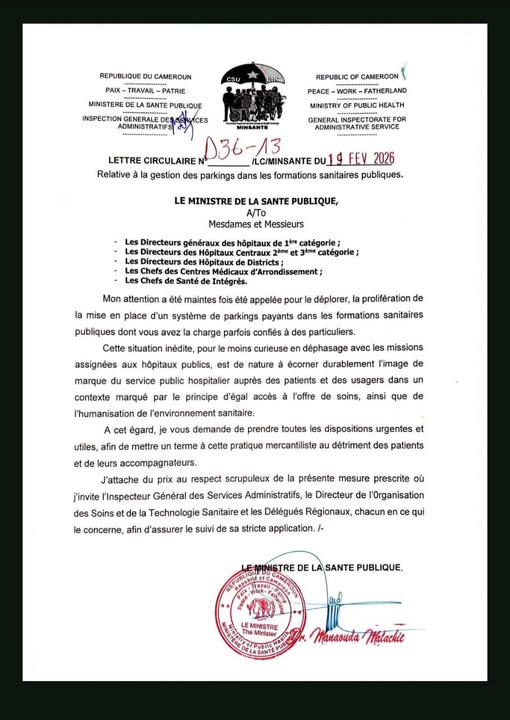 Le ministre de la Santé publique, Malachie Manaouda, a signé le 19 février une circulaire mettant un terme aux parkings payants dans les formations sanitaires publiques du Cameroun. Le document, adressé aux responsables hospitaliers, ordonne l’arrêt immédiat de toute tarification du stationnement au sein des hôpitaux concernés.
