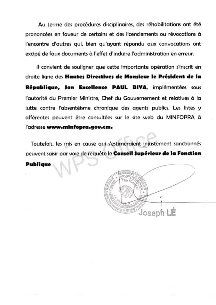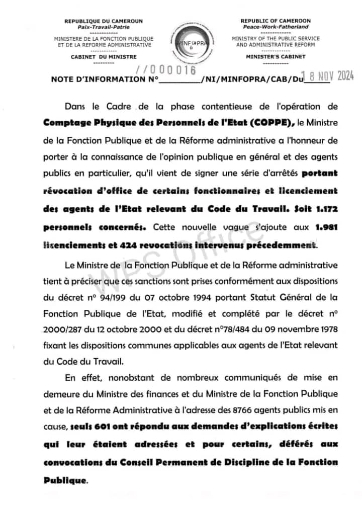 La note d’information signée le 18 novembre 2024 par le ministre camerounais de la Fonction Publique, Josephj LE annonçant la radiation de 1172 agents des effectifs de la Fonction publique fait le tour des réseaux sociaux. Ces fonctionnaires et autres agents de l’État relevant du Code du travail viennent s’ajouter, souligne le ministre Lé, à deux autres vagues de 1981 et 424 personnels de l’État ayant subi le même sort, il y a peu. Ce qui fait au total un effectif de 3 577 personnels radiés à date.