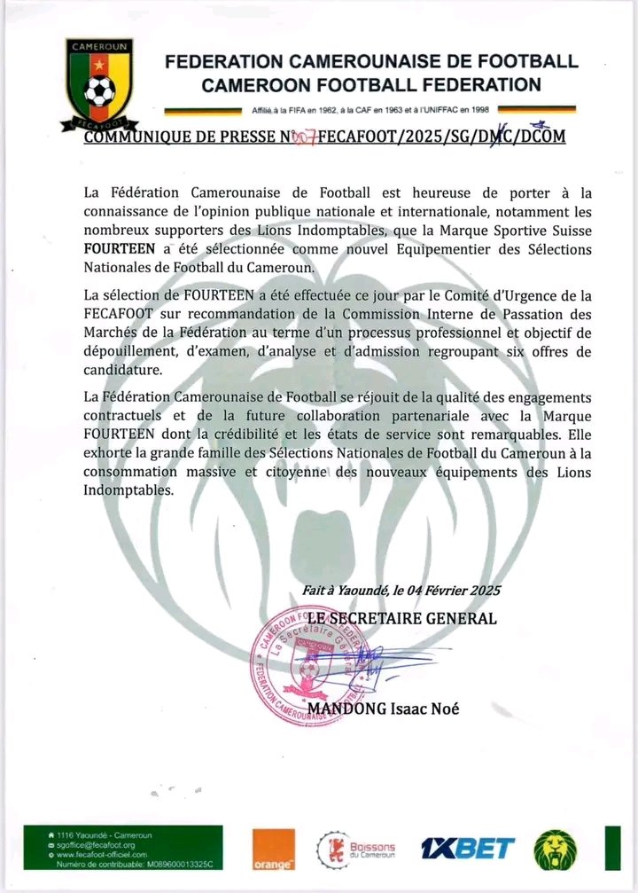 Comme pour One All Sport, je respecte le choix de la FECAFOOT de dealer avec FOURTEEN. On ne peut pas reprocher à la fédération de dealer avec qui elle veut en matière d’équipementier. En revanche, ON EST EN DROIT D’EN ATTENDRE LE MEILLEUR BÉNÉFICE POSSIBLE pour notre football. FOURTEEN est un équipementier jeune, alors il n’y a pas de raison pour nous de lui ouvrir nos portes s’il nous garantit un minimum en cette période où notre football va mal. On n’a juste pas besoin de revivre les multiples promesses non tenues comme pour One All Sports: ceci dit qu’on espère qu’à la fédération, on a su tirer les leçons des précédents échecs. On ne peut donc pas être péremptoire dans les conclusions, tant qu’on n’a pas le contenu du contrat, mais on peut cependant souhaiter la bienvenue à FOURTEEN, en espérant qu’il nous apportera de la stabilité autant qu’il gagnera en visibilité auprès des Lions.