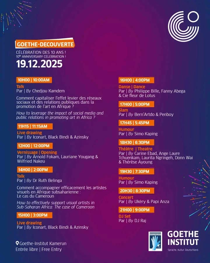 Raphaël Mouchangou:Il s’agit d’un programme très dense qui commence des 10h du matin ce vendredi 19.12.2025 au Goethe-Institut avec un talk. Puis tout au long de la journée s’enchaînent diverses activités ludiques, artistiques, récréatives ou de réflexion. Nous clôturons ce programme marathon avec un spectacle sur scène avec du stand up, du slam et de la musique. Un Dj Set refermera la soirée pour les plus énergiques. Le programme été conçu par un comité de 5 artistes qui ont longuement accompagné cette plateforme et à qui nous avons donné la liberté de sélection et de programmation.