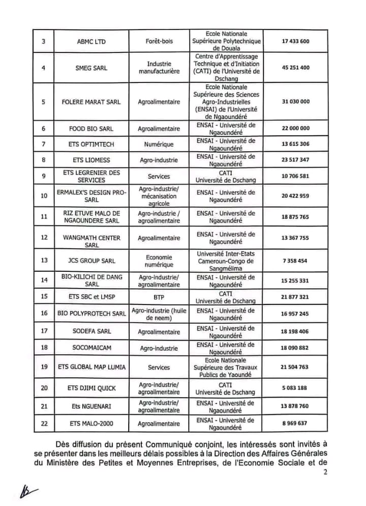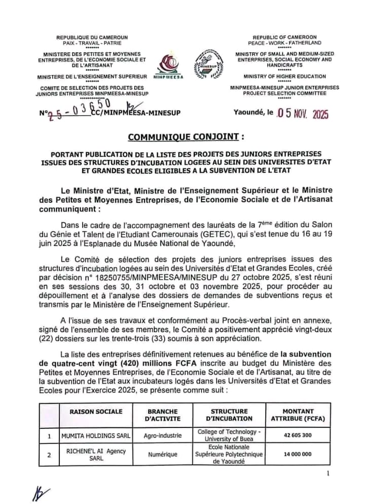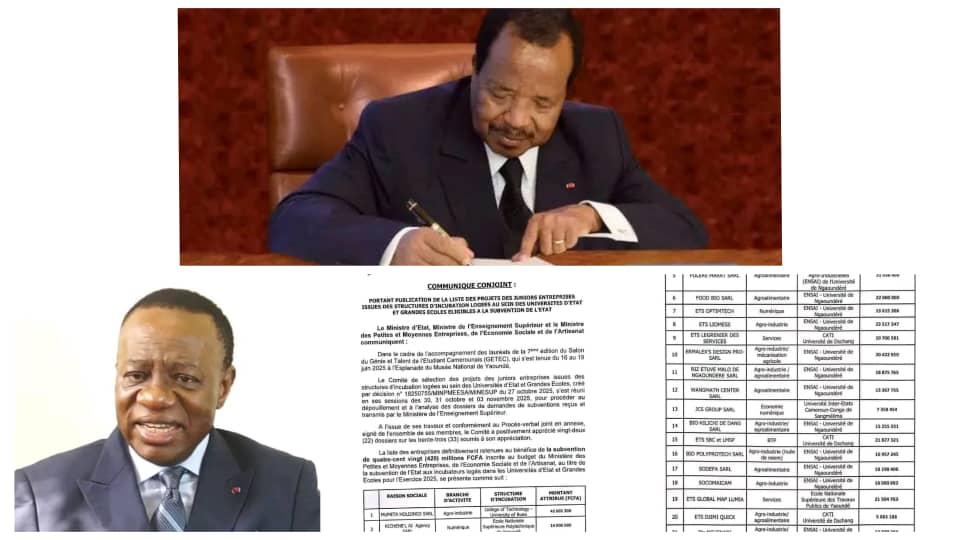 Le Cameroun franchit une nouvelle étape dans sa politique de soutien à la jeunesse. À travers un communiqué conjoint du Ministère de l’Enseignement Supérieur (MINESUP) et du Ministère des Petites et Moyennes Entreprises, de l’Économie Sociale et de l’Artisanat (MINPMEESA), le gouvernement annonce l’octroi d’une enveloppe de 420 millions de FCFA destinée aux jeunes porteurs de projets incubés dans les universités publiques et grandes écoles du pays.