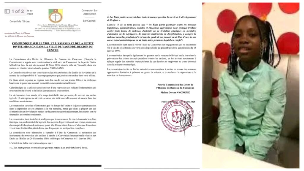 La ville de Yaoundé est sous le choc après le viol suivi de l’assassinat de la jeune Divine Mbarga, âgée de 11 ans, dans la nuit du mercredi 18 mars 2026. Le drame s’est produit dans une maison en chantier située au quartier Nkoabang.