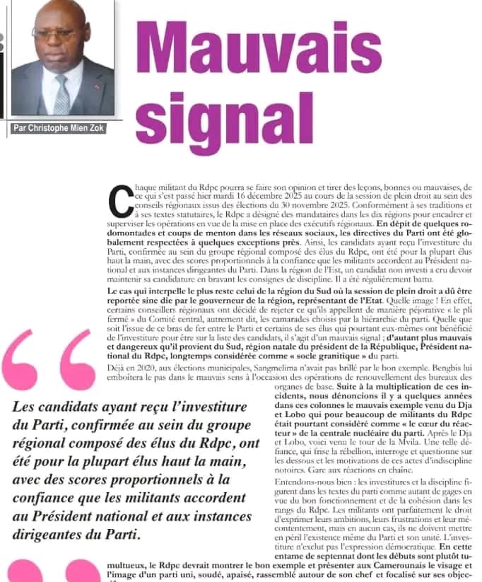 Chaque militant du RDPC pourra se faire son opinion et tirer des leçons, bonnes ou mauvaises, de ce qui s’est passé hier mardi 16 décembre 2025 au cours de la session de plein droit au sein des conseils régionaux issus des élections du 30 novembre 2025.