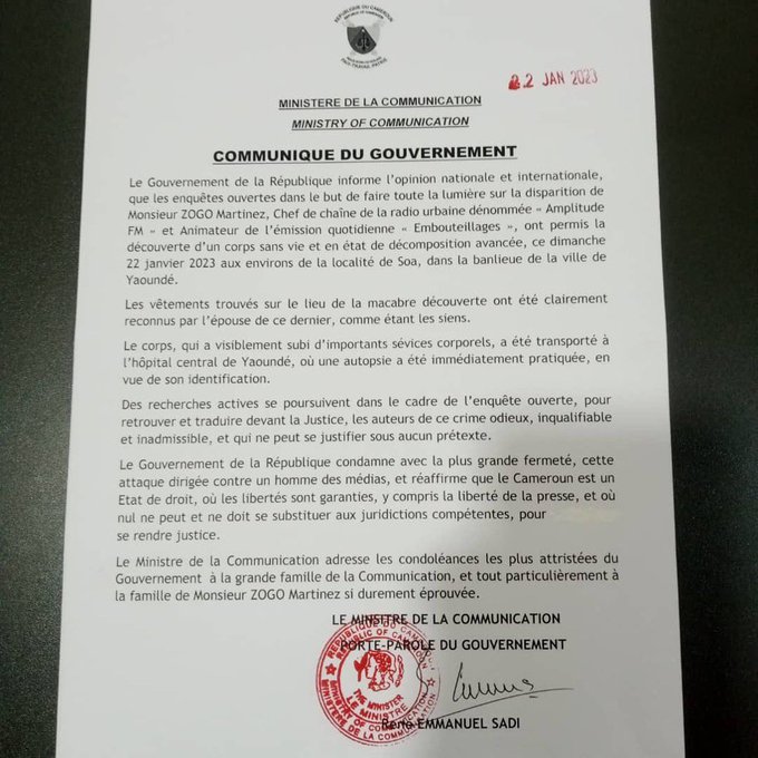 Disparu dans la nuit du 17 Janvier 2023, le corps du chef de Chaine d’Amplitude Fm été finalement retrouvé le dimanche 22 Janvier 2023 dans un état de décomposition avancée à Soa, dans la banlieue de Yaoundé. La presse camerounaise, la société civile et la classe politique s’indignent contre cet assassinat et réclame la justice.