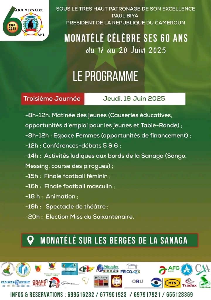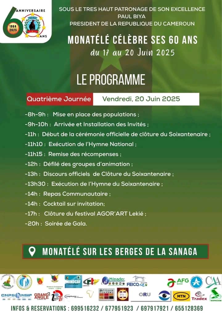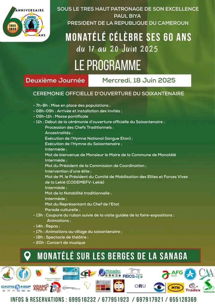 La préparation de cet événement, qui marque le 60ᵉ anniversaire de la ville fondée le 20 juin 1964, est bien avancée. « Nous œuvrons sans relâche pour que cette célébration soit à la hauteur de l’histoire de notre ville, qui a eu l’honneur d’accueillir le président Paul Biya à deux reprises lors du lancement de ses campagnes présidentielles », déclare le maire de Monatélé avec enthousiasme.