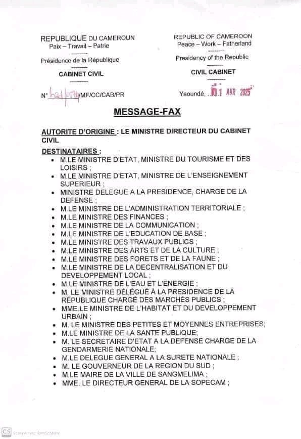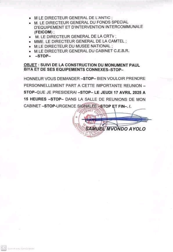 Le ministre directeur du cabinet civil MVONDO AYOLO convoque presque tout un gouvernement au palais présidentiel d’Etoudi à Yaoundé le jeudi, 17 Avril 2025 pour faire le point sur l’avancement des travaux de construction du monument Paul Biya.