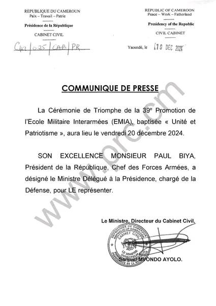 Le Chef de l’Etat a décidé se faire représenter par son ministre délégué à la Défense, Joseph Beti Assomo. Dans l’opinion, le débat sur les capacités physiques du Chef suprême des Armées est relancé. Le vendredi 20 décembre 2024 à la sortie de la 39e promotion de l’École Militaire Interarmées (EMIA), baptisée « Unité et Patriotisme », Paul Biya est absent. Pour une seconde fois depuis 42 ans, le Chef de l’Etat, Chef suprême des Armée ne prendra pas part à une cérémonie de sortie d’une promotion d’officiers de l’EMIA.