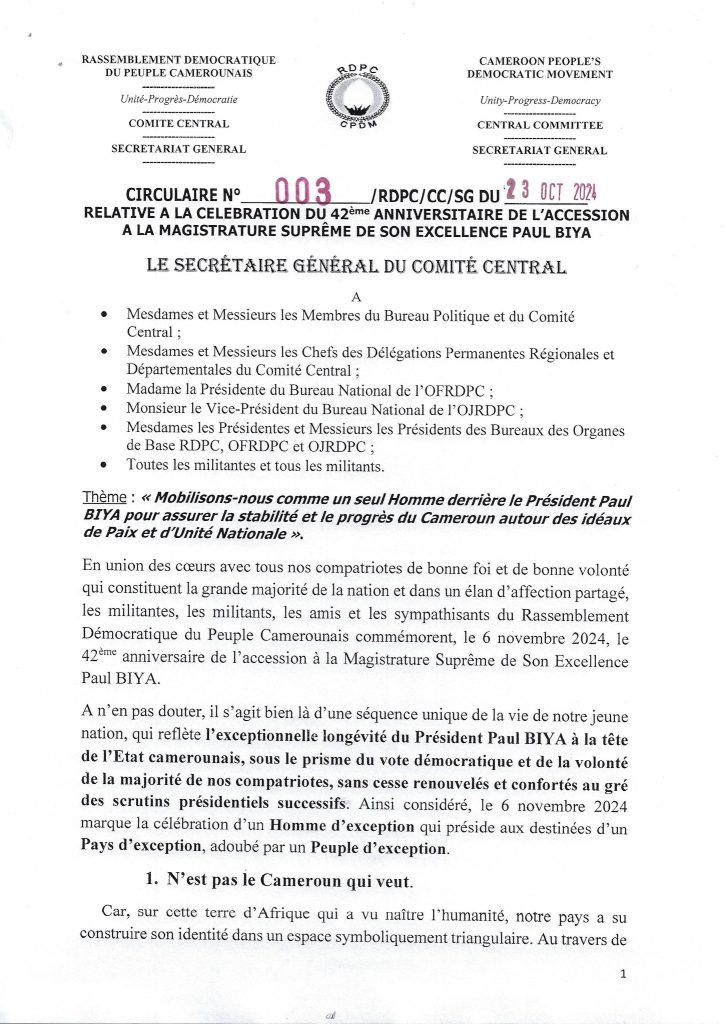 An 42 de Paul BIYA le Renouveau: La Circulaire de Comité Central du RDPC