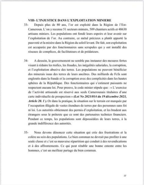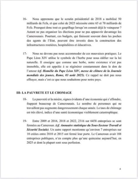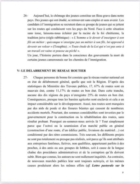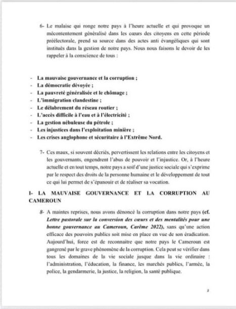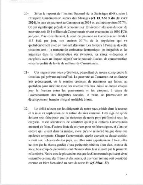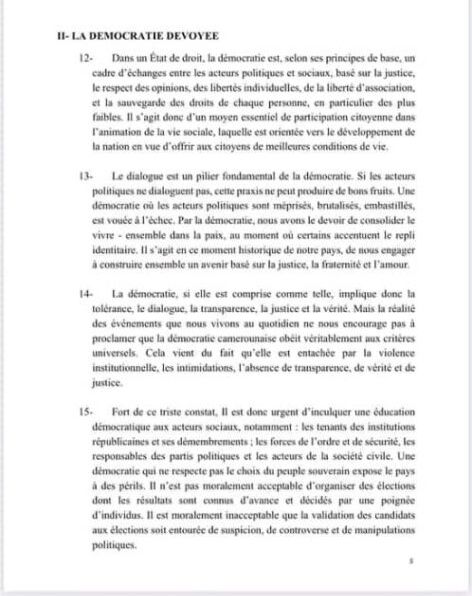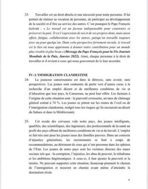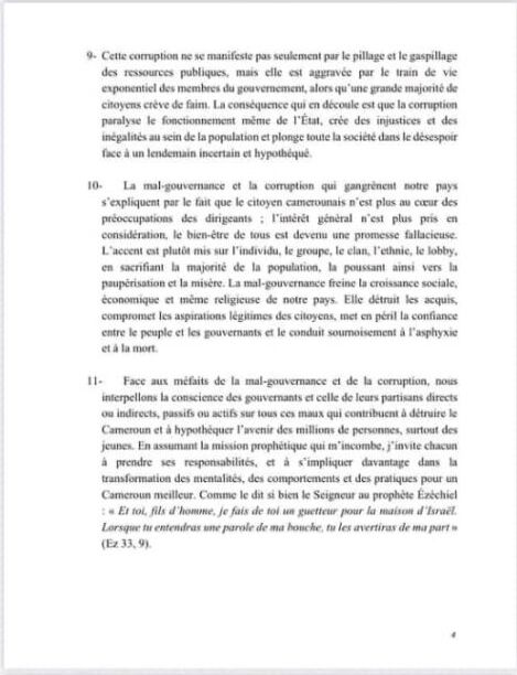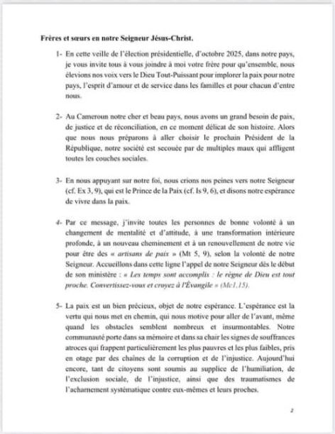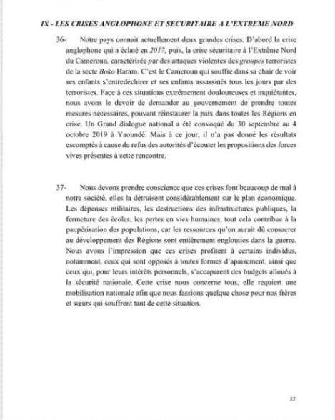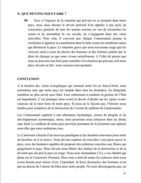 « Dieu nous a dotés de toutes les richesses nécessaires pour mieux vivre. La force destructrice des hommes ne peut surpasser l’amour de Dieu pour notre peuple. Ne nous décourageons pas : un Cameroun nouveau est possible, par la conversion des cœurs et des mentalités. Si, avec foi, nous déposons nos fardeaux aux pieds de la Croix de Celui à qui rien n’est impossible, et qui nous dit : “N’ayez pas peur, j’ai vaincu le monde” (Jn 16, 33). »