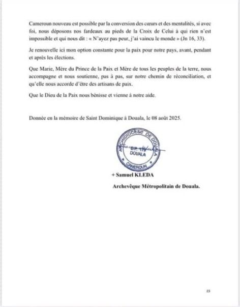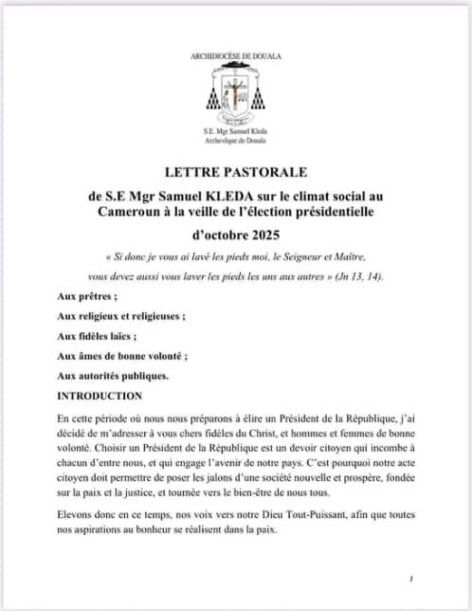 Dans une lettre pastorale au ton grave, Monseigneur Samuel Kleda dresse un tableau alarmant de la situation sociopolitique du Cameroun à la veille de l’élection présidentielle. L’archevêque métropolitain de Douala énumère les maux qui, selon lui, minent le pays :