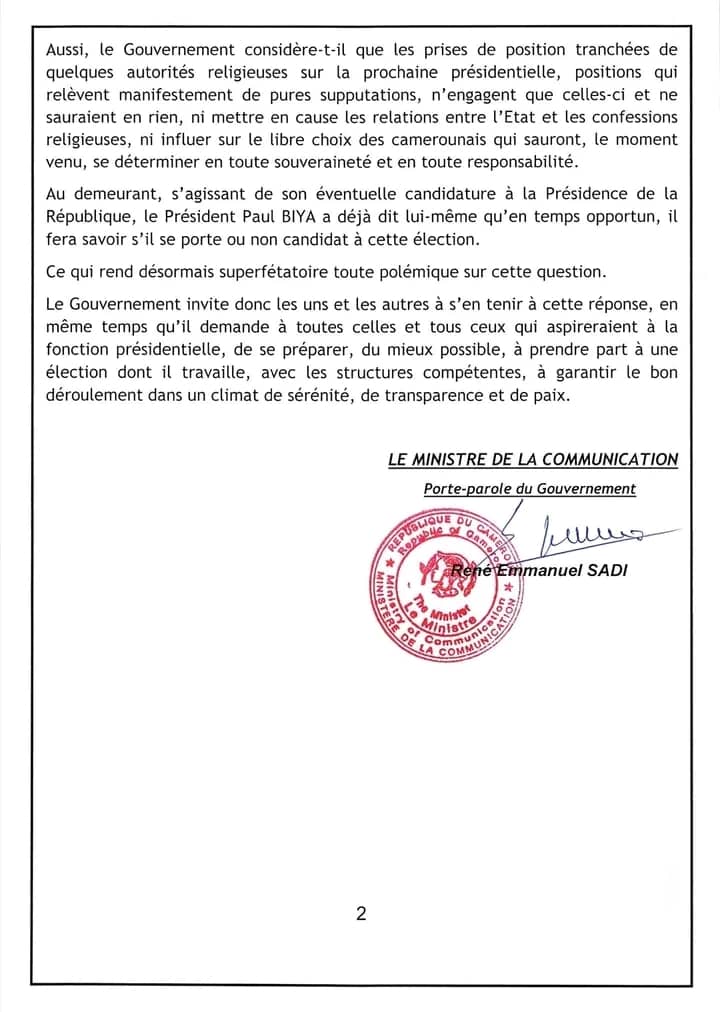 Aussi, le Gouvernement considere-t-il que les prises de position tranchées de quelques autorités religieuses sur la prochaine présidentielle, positions qui relèvent manifestement de pures supputations, n’engagent que celles-ci et ne sauraient en rien, ni mettre en cause les relations entre l’Etat et les confessions religieuses, ni influer sur le libre choix des camerounais qui sauront, le moment venu, se déterminer en toute souveraineté et en toute responsabilité.