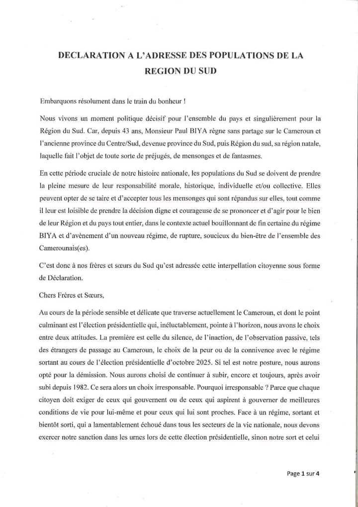 Votre engagement dans les prochaines élections, après tant d’années de sacrifices, vous permettra enfin de voir la lumière, guidée par une nouvelle gouvernance soucieuse de vos conditions de vie et du développement de notre région. Refusez désormais d’être les otages de politiciens véreux qui vous instrumentalisent à des fins personnelles, en vous opposant à vos compatriotes des autres régions de notre pays. Brisez les chaînes de cette éducation humiliante à la servitude, qu’elle soit volontaire ou imposée. Alors, vous deviendrez de véritables citoyens, et non plus de simples sujets exposés à la risée des hommes libres. » Extrait de la declaration