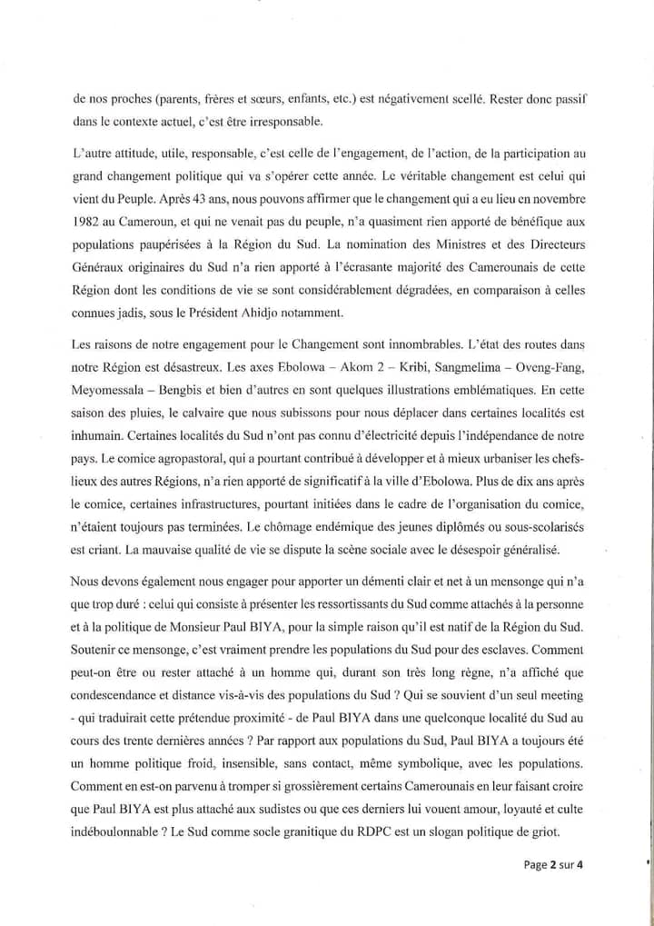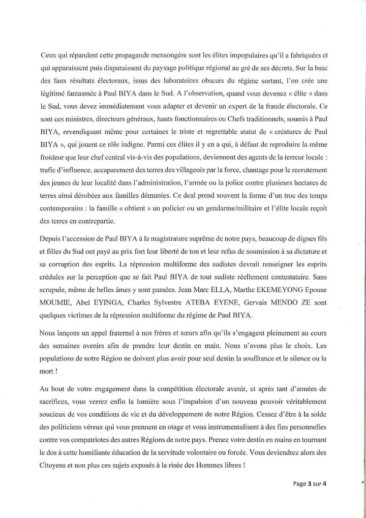 « Depuis l’accession de Paul Biya à la magistrature suprême de notre pays, de nombreux fils et filles dignes du Sud ont payé au prix fort leur liberté de ton et leur refus de se soumettre à la dictature et à la corruption des esprits. La répression multiforme exercée à l’encontre des Sudistes devrait éclairer les esprits encore crédules sur la perception que Paul Biya a de tout véritable contestataire issu du Sud. Sans scrupules, même de nobles âmes ont été sacrifiées. Jean-Marc Ella, Marthe Ekemyong épouse Moumié, Abel Eyinga, Charles Sylvestre Ateba Eyene, Gervais Mendo Ze… autant de victimes de la répression orchestrée par le régime de Paul Biya.