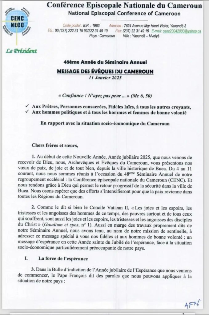 Le fil conducteur du message, intitulé « Confiance ! N’ayez pas peur », dresse un bilan préoccupant de l’état socio-économique du Cameroun, 35 ans après leur première lettre pastorale sur la crise économique.